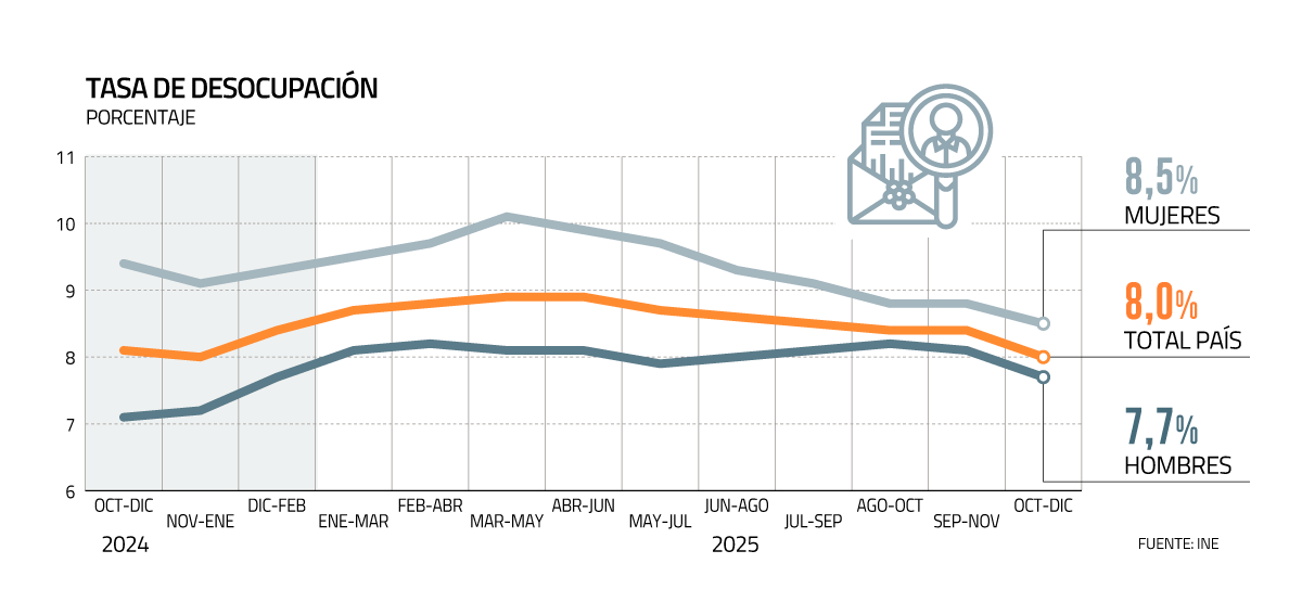 Según informó este jueves el Instituto Nacional de Estadísticas (INE), la tasa de desocupación en Chile bajó a 8% durante el trimestre octubre-diciembre de 2025, un dato con el cual el indicador retoma la senda de disminuciones luego de un aumento interanual en el trimestre pasado.