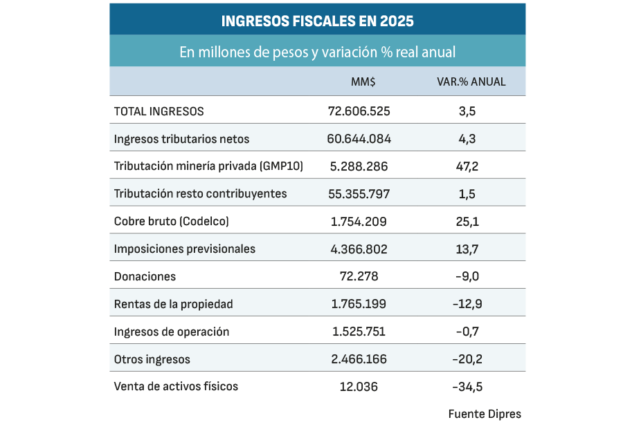 Por el lado de los ingresos, el año pasado la recaudación se expandió un 3,5% respecto de 2024, de la mano de un alza de 4,3% en la recaudación tributaria, la que se explica por el dinamismo de la recaudación de la minería privada, que creció un 47,2% en 12 meses, debido a la implementación del Royalty Minero y el alza en el precio del cobre.