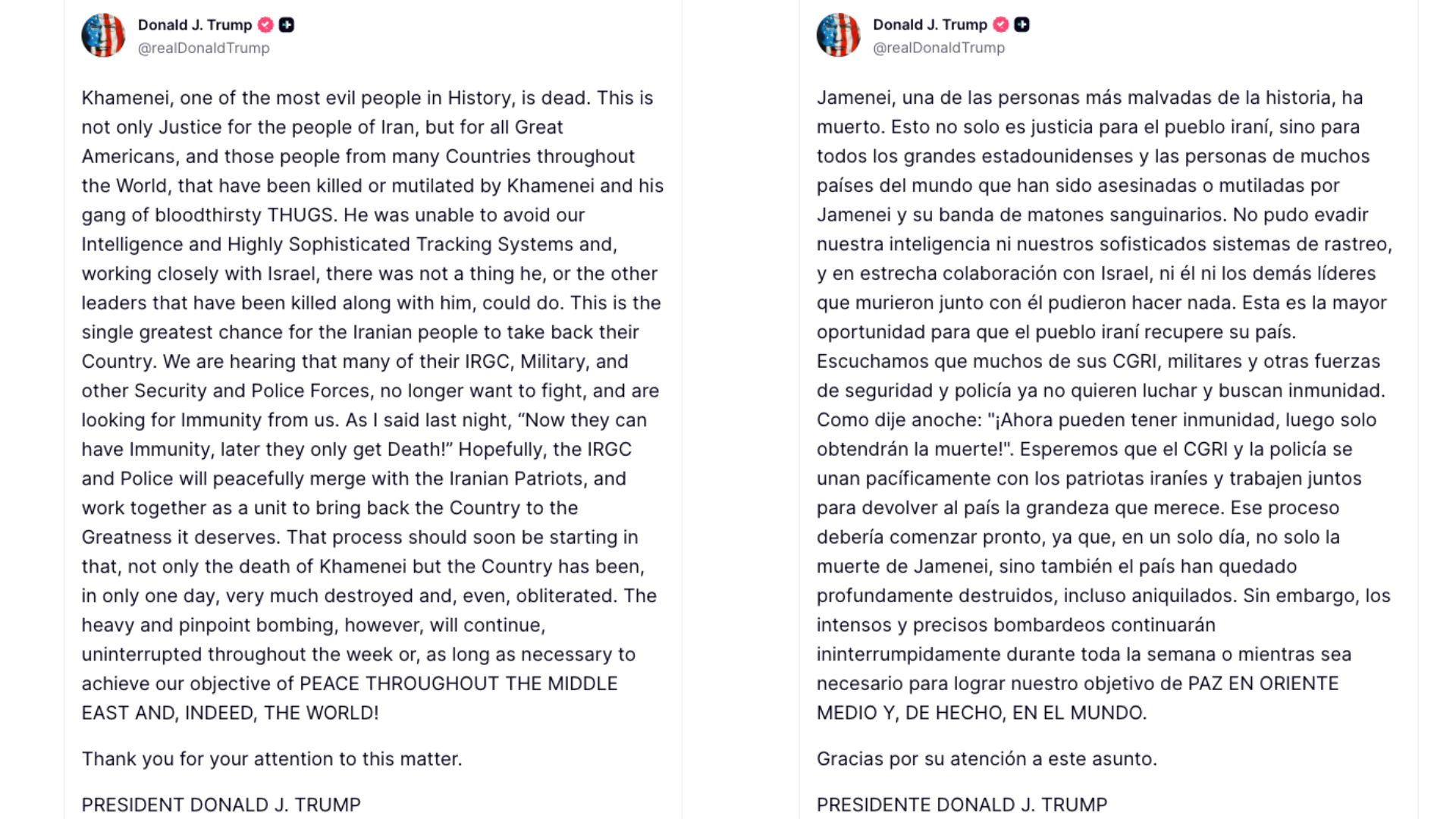 El presidente añadió que los “bombardeos intensos y precisos” contra Irán “continuarían ininterrumpidamente durante toda la semana o mientras sea necesario para lograr nuestro objetivo de Paz en Todo Medio Oriente”.