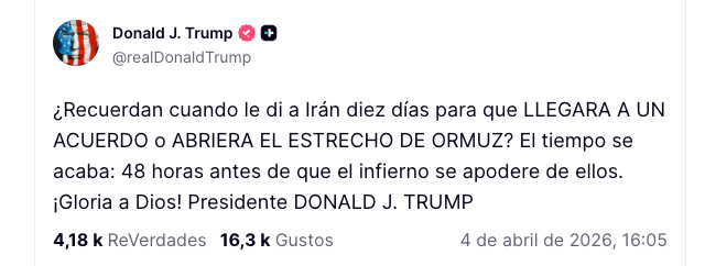 “¿Recuerdan cuando le di a Irán diez días para que llegara a un acuerdo o abriera el estrecho de Ormuz?”, escribió el mandatario, agregando que “el tiempo se está acabando: 48 horas antes de que se desate el infierno”, en una advertencia que marca un nuevo endurecimiento de su posición.