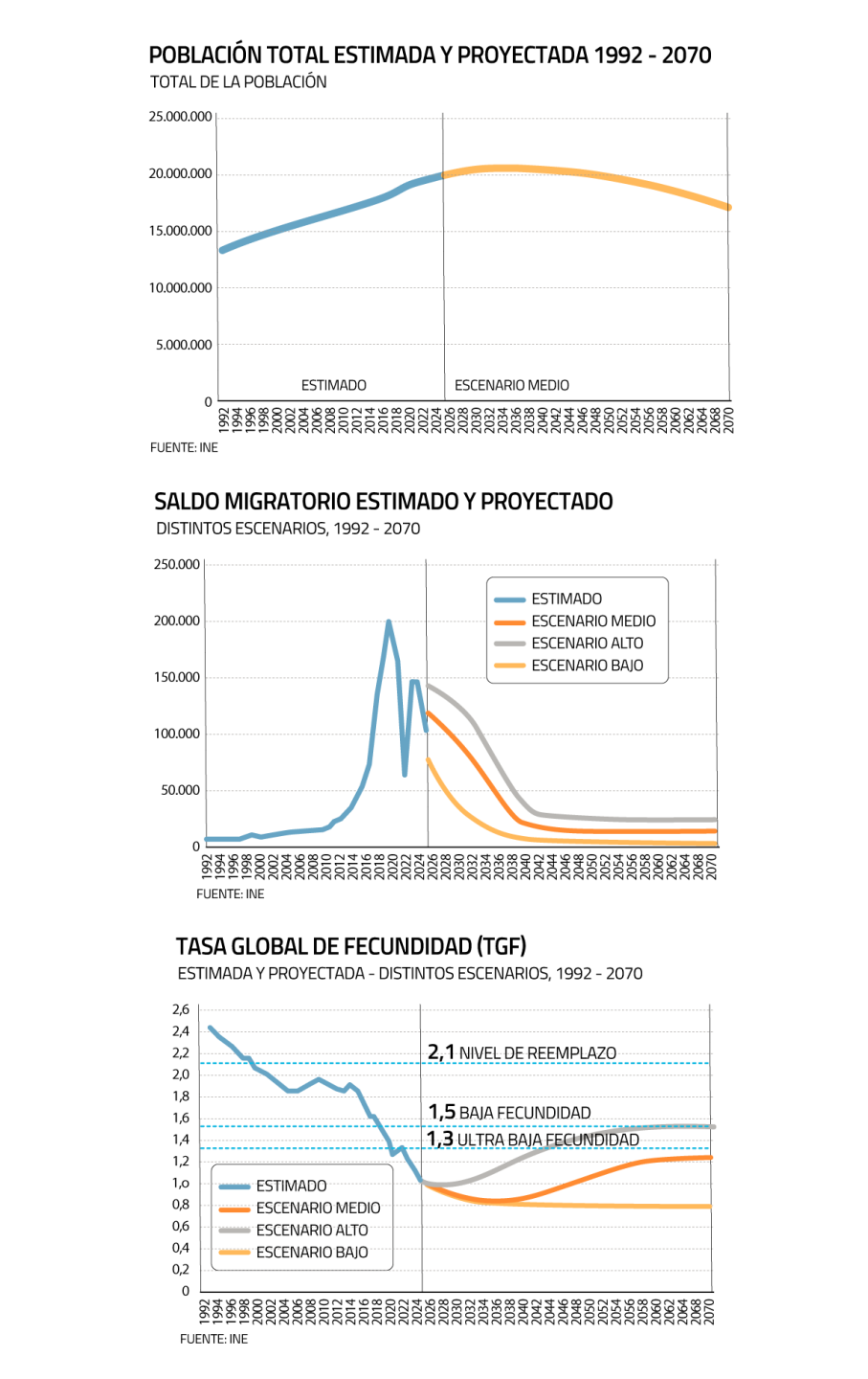 Las cifras también distan de la última estimación realizada por el INE en 2017, en la cual se preveía un ascenso de la población desde 18,8 millones proyectados para 2018 a 21,6 millones en 2050.