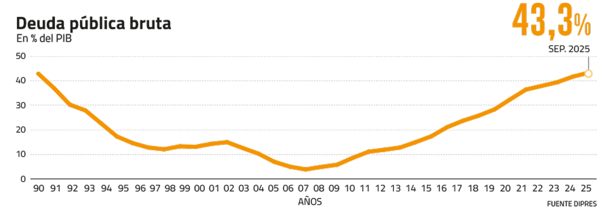 El control de la deuda también será un desafío relevante para el próximo período. A septiembre de este año, la deuda bruta llegó a US$ 149.182 millones, equivalente a 43,3% del PIB, el mayor nivel como porcentaje del producto en al menos 35 años.
