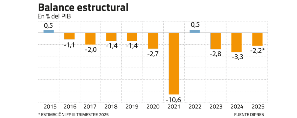 Para 2026, en tanto, nuevamente el presupuesto se hizo con una meta de déficit estructural de -1,1% del PIB, pero según algunos economistas, dado el mayor deterioro de 2025, podría llegar a entre -1,5% y -2% del PIB, si no se hacen ajustes importantes como los comprometidos.