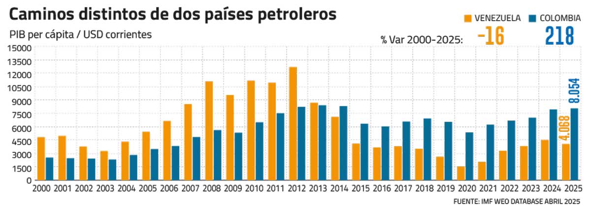 La diferencia es notoria cuando se compara el destino de Venezuela con el de Colombia, país vecino y también petrolero. Mientras, Colombia ha multiplicado su PIB per cápita en un 218% desde el 2000, el de Venezuela se ha contraído un 16%.