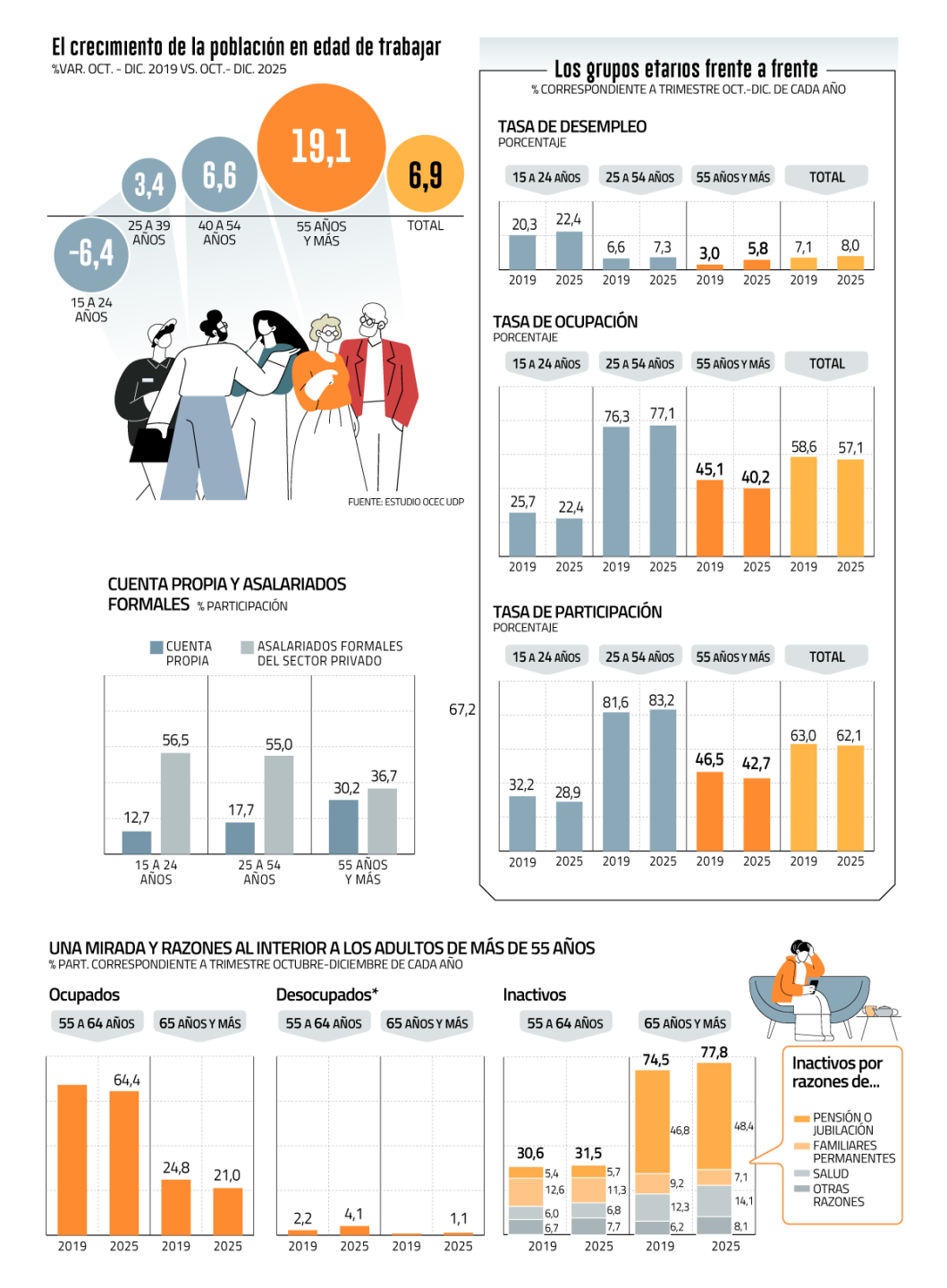 El informe del OCEC UDP explica que en este comportamiento puede influir la composición del empleo. A diferencia de los otros segmentos, entre los trabajadores de 55 años y más se observa una mayor inserción en el trabajo por cuenta propia y una menor participación en trabajos asalariados formales del sector privado.