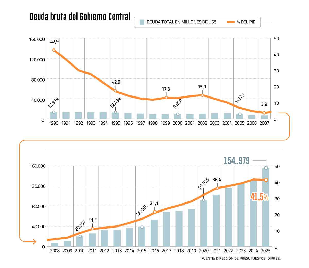Según el reporte, a diciembre del 2025 el stock representó un 41,5% del tamaño de la economía, una mejoría si se contrasta con el 41,7% que había sido reportado por la misma Dipres con información preliminar del cierre presupuestario de diciembre, antes de conocerse el resultado de las Cuentas Nacionales del cuarto trimestre del 2025.