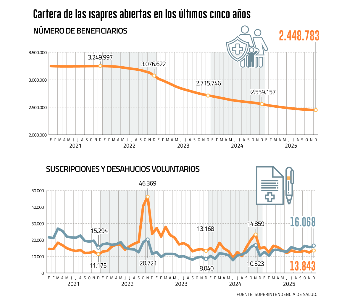 En 2025 no lograron frenar el desangre. Recientemente, la Superintendencia de Salud -organismo que supervisa a las aseguradoras- publicó las cifras consolidadas de la cartera de beneficiarios (cotizantes más cargas) del sistema privado. Durante el último ejercicio, las isapres perdieron otros 110 mil afiliados, cayendo a un total de 2.448.783.