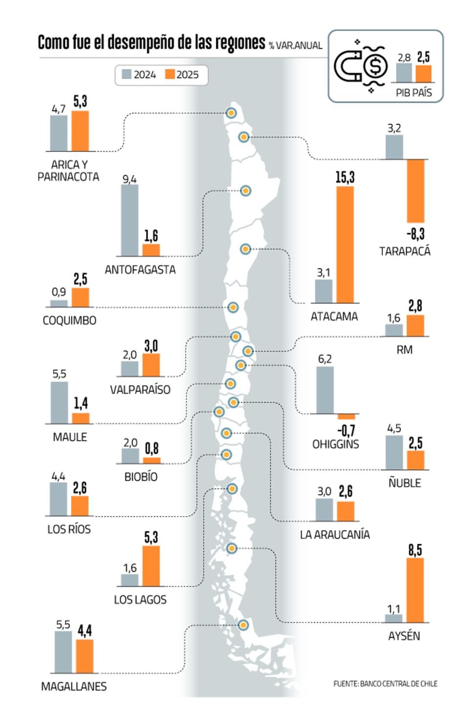Por debajo del PIB del país de 2,5% en 2025, están las regiones de Antofagasta, Maule y Biobío.