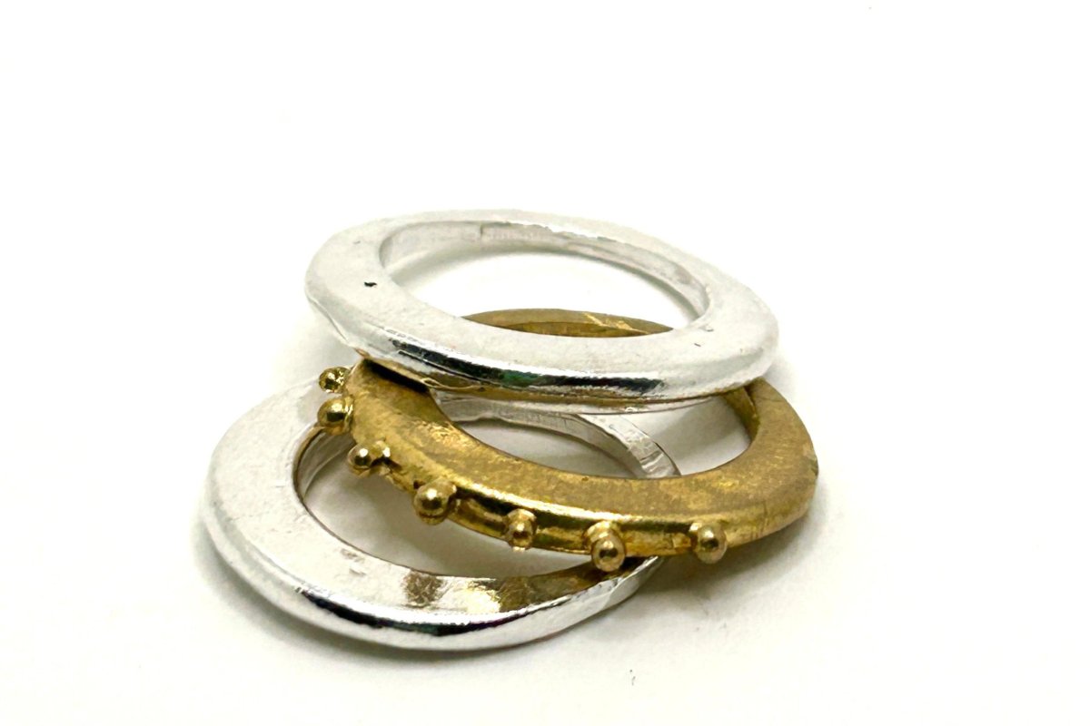 Brunser no viene de una escuela tradicional de joyería. Estudió diseño gráfico, trabajó años en agencias y, tras el nacimiento de su primera hija, tomó un curso de orfebrería casi por intuición. Era 2002. Desde entonces, no ha dejado de formarse, probar técnicas, equivocarse y volver a empezar. Pero su historia con las joyas no comenzó ahí. Su fascinación venía de antes: de niña se quedaba pegada frente a las vitrinas mirando pulseras, aros y collares, y no resistía la tentación de sacarle los anillos a su abuela para probárselos a escondidas. En el colegio, mientras el resto del curso aprendía metalmecánica -cambiar enchufes, armar circuitos-, ella hacía otra cosa: robaba pedazos de alambre eléctrico, los enrollaba y fabricaba pulseras que luego vendía en el recreo.