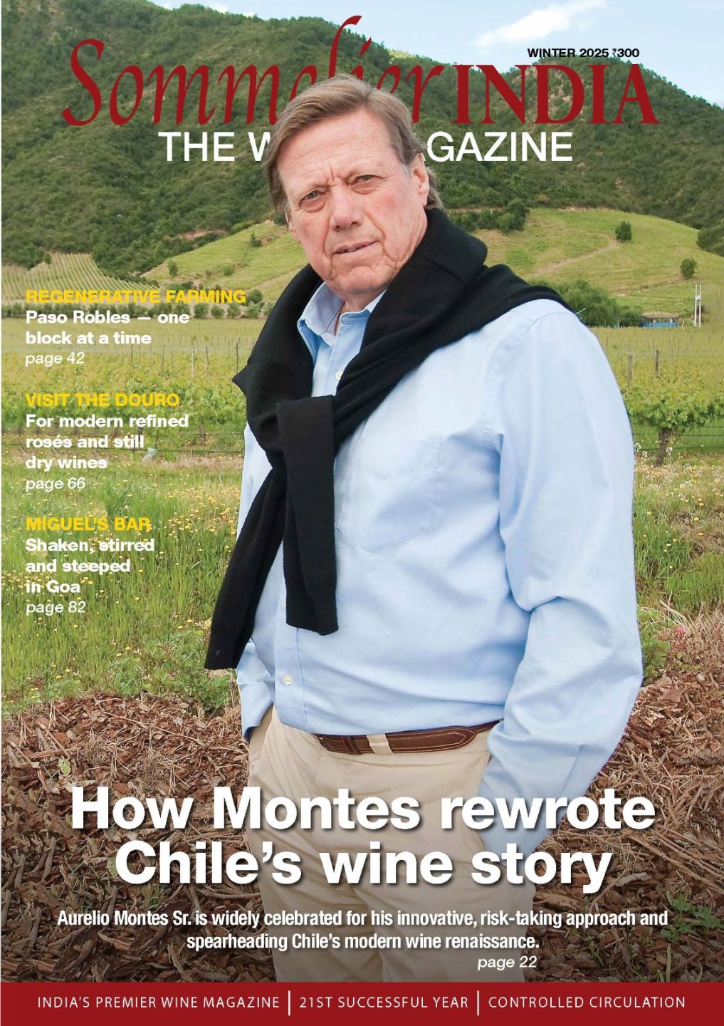 Son 53 vendimias las que tiene en el cuerpo Aurelio Montes, el cofundador de la viña que lleva su apellido y que por estos días se está convirtiendo en una figura muy conocida en India. La última edición de la reconocida revista Sommelier India le acaba de dedicar al empresario chileno su portada y un extenso artículo titulado “Cómo Montes reescribió la historia del vino en Chile”, abordando allí su vida y trayectoria, y destacando el haber sido el artífice de la premiumización del vino chileno.