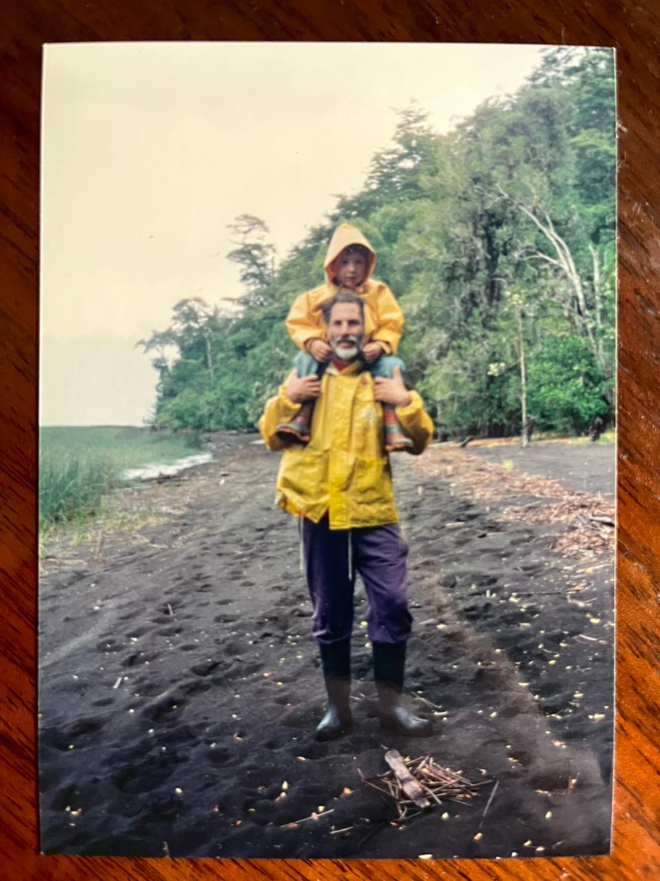 Damián niño junto a su padre en un viaje al sur, al lago Todos los Santos.