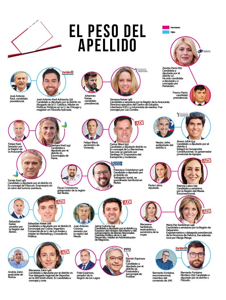 La técnica de repetir apellidos en candidaturas ha sido un recurso ancestral en la política chilena. Este año también: varios candidatos que debutan en la elección parlamentaria registran vínculos familiares con políticos.