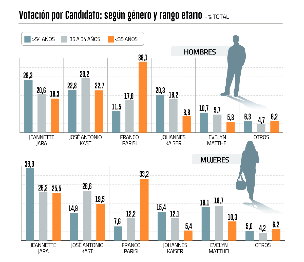 Por el contrario, entre los hombres menores de 35 años fue la tercera preferencia, por detrás de Franco Parisi y quien será su contendor, el republicano José Antonio Kast.