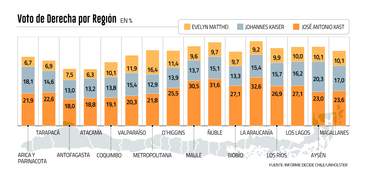En este contexto, La Araucanía fue aquella con el porcentaje más grande. En esta zona, el apoyo a Kast, Kaiser y Matthei llegó a 57,2%, mientras que Atacama fue el otro extremo con 38,3%.