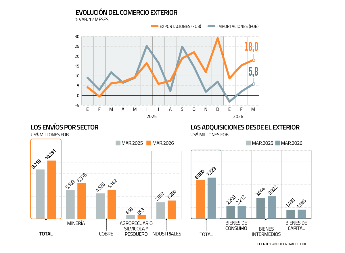 Dado lo anterior, el saldo comercial de Chile se expandió 62% en marzo frente al mismo mes de 2025 para sumar US$ 3.061 millones.