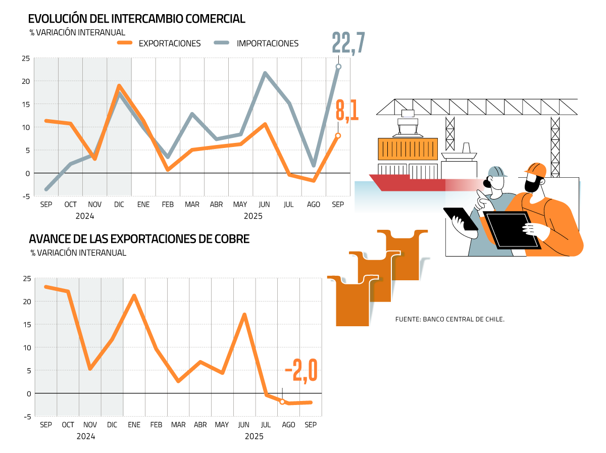 Las importaciones también tuvieron incrementos durante septiembre: en el mes registraron un alza de 22,7%, respecto al mismo mes del año anterior, significando adquisiciones desde el exterior por US$ 8.033 millones.