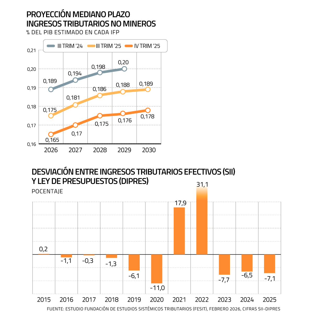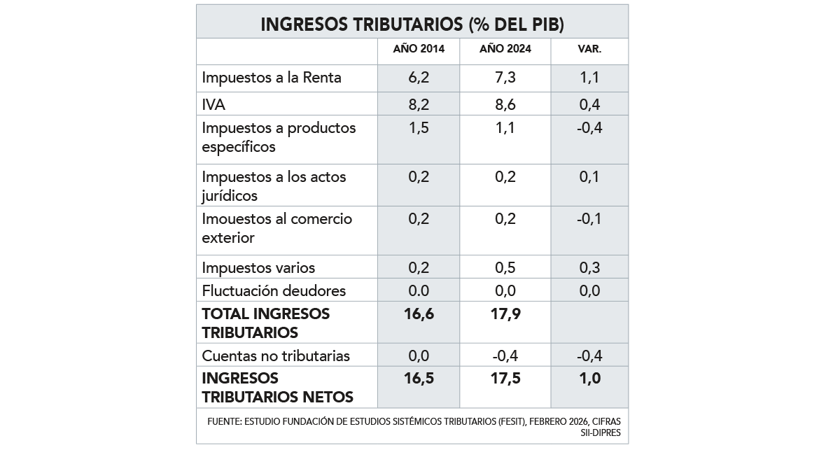 El estudio expuso que la tendencia al estancamiento de la recaudación tributaria no minera no es solo en el corto plazo, sino que se constata en los últimos 10 años, incluido tanto el IVA como Renta. En dicho período el promedio fue de 17,77% del PIB y para 2025 dicha recaudación se calcula que terminará a lo más en 17,9% según las cifras del Informe de Finanzas Públicas (IFP) del cuarto trimestre del ejercicio pasado.