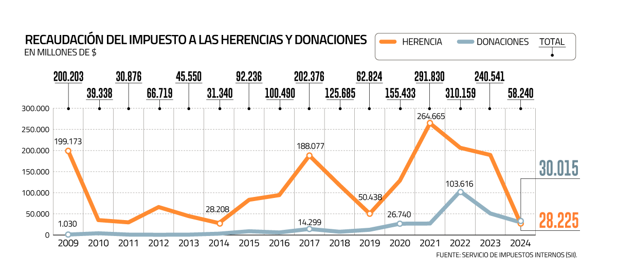 Según datos del Servicio de Impuestos Internos (SII), en el año comercial 2024 (ejercicio tributario 2025) el Fisco recaudó apenas US$ 64 millones ($ 58.240 millones) gracias a los impuestos a las herencias y las donaciones, lo que implica una caída de 75,7% respecto al año previo.