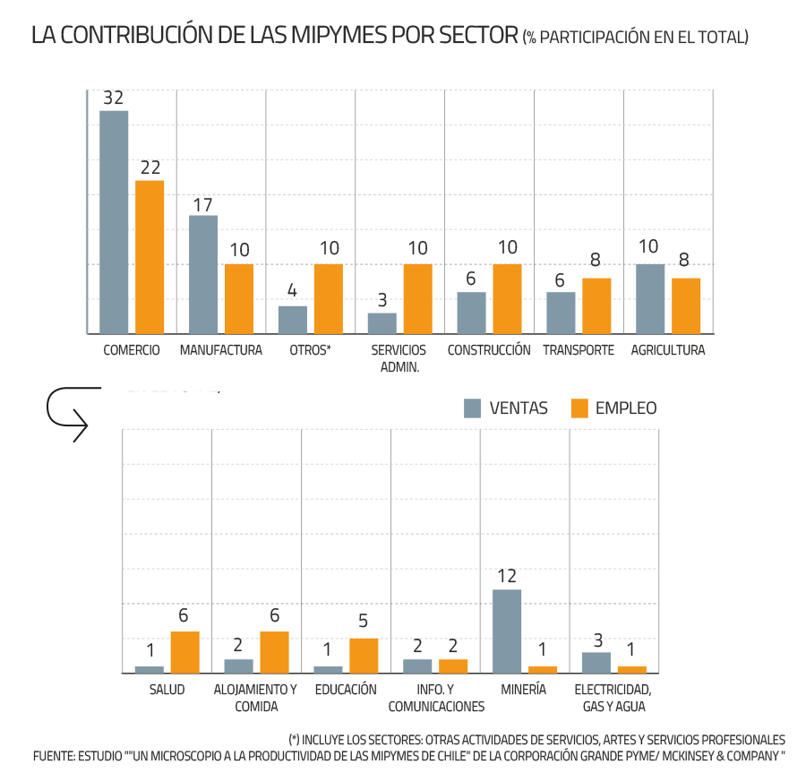 En Chile, las micro, pequeñas y medianas empresas representan el 64% del empleo y el 45% de las ventas. Una relevancia en la economía que no se refleja en sus indicadores de productividad, según constató el estudio “Microscopio de las pequeñas empresas en Chile”, elaborado por McKinsey & Company y Grande Pyme.