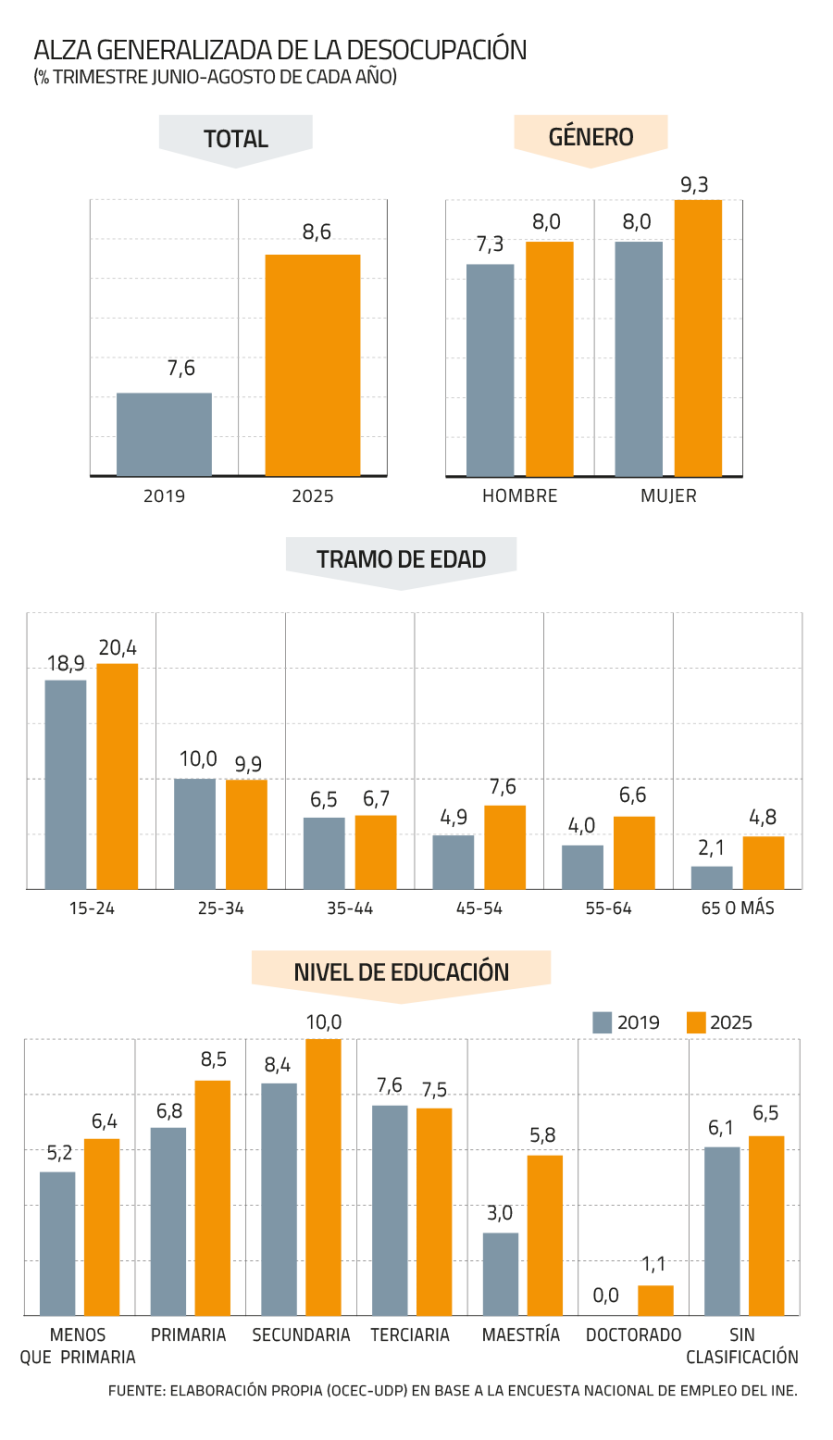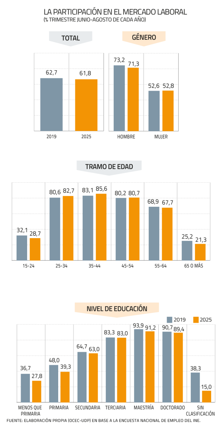 “Si bien la tasa de informalidad muestra una leve reducción, esta permanece elevada y concentrada entre mujeres, jóvenes y personas mayores, lo que confirma su carácter estructural. En conjunto, Chile aún no ha recuperado plenamente la tasa de ocupación previa al estallido social y la pandemia, debido a un entorno económico y productivo que no ha sido capaz de atraer y emplear el mayor capital humano disponible”, expone el informe.