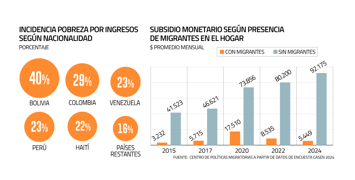 En 2024, las mayores tasas de pobreza por ingreso se concentraron en migrantes provenientes de Bolivia (40%) y Colombia (29%), en tanto peruanos y venezolanos se mantuvieron dentro del promedio con 23%, mientras que los haitianos ligeramente más abajo con 22%.