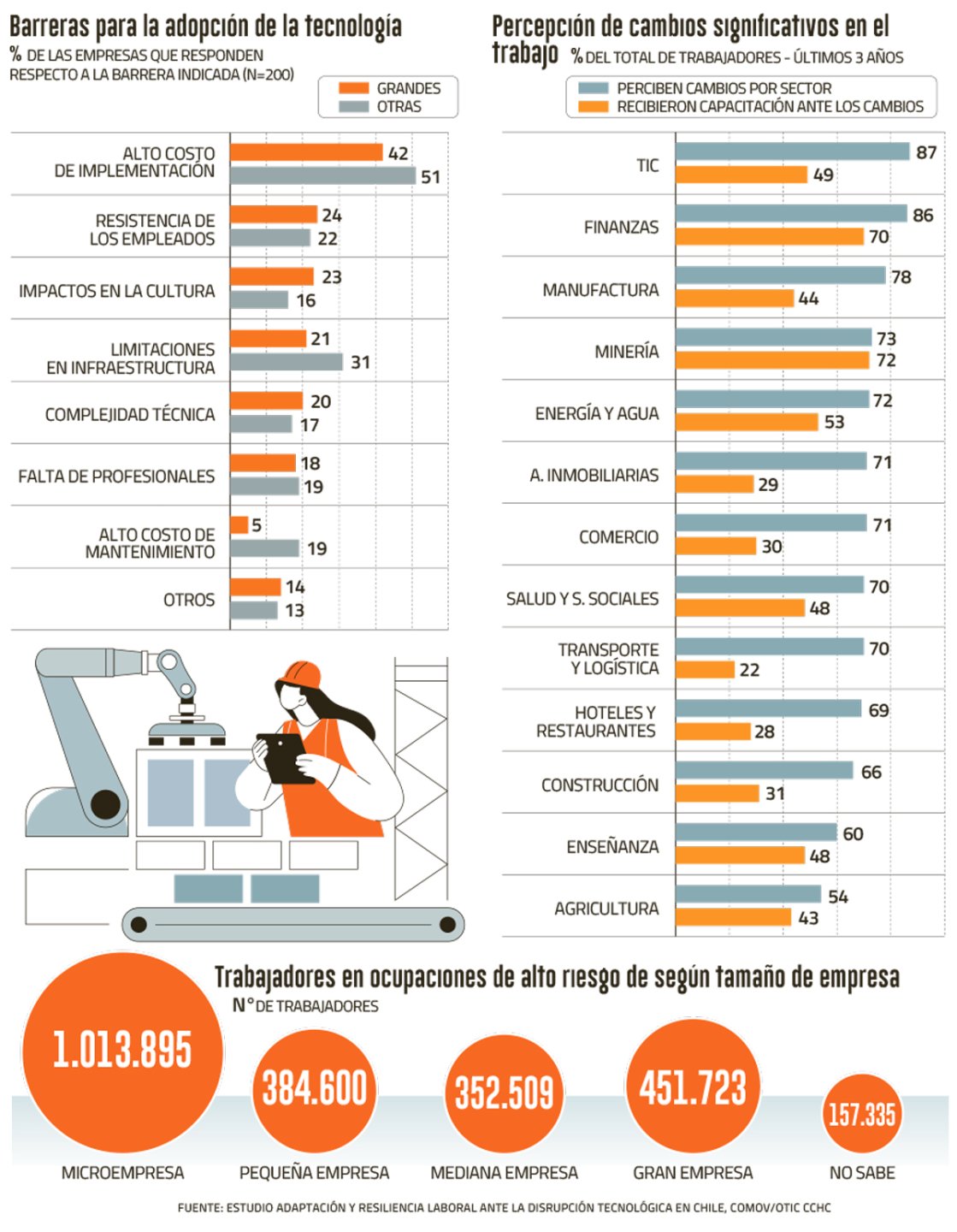 Los asistentes virtuales o los robots realizando tareas de embalaje son solo dos ejemplos de la transformación que está protagonizando el mercado laboral en el mundo y Chile no está ajeno a ese fenómeno. Un estudio elaborado por CoMov para la OTIC de la Cámara Chilena de la Construcción (CChC) concluyó que 2,4 millones de trabajadores locales enfrentan un alto riesgo de ser desplazados por la tecnología.