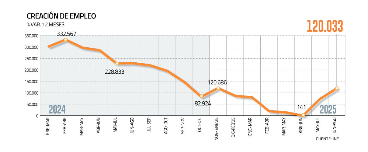 Los datos del INE mostraron, además, que en el último año las personas con trabajo aumentaron 1,3%. Dicho de otra forma, en los últimos 12 meses se crearon 120.033 nuevos puestos laborales, totalizando 9.355.097.