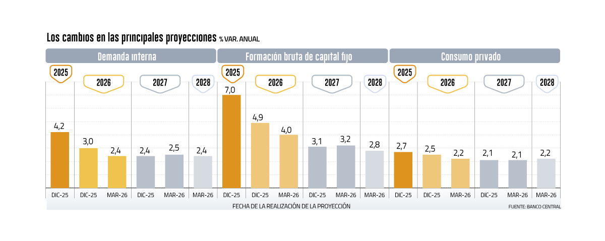 Sin embargo, pese a esto, fue enfática en señalar que “la definición y la evaluación de la sostenibilidad fiscal en nuestra institucionalidad le corresponden al Consejo Fiscal Autónomo. Decía tanto la Guerra de Medio Oriente, como el cambio en el precio de los combustibles internamente, como los ajustes fiscales, como también los desarrollos de la minería, son los factores que están detrás de este ajuste en la proyección de crecimiento que hacemos en este informe, que pasa de estar entre 2% y 3% a estar entre 1,5% y 2,5%”.