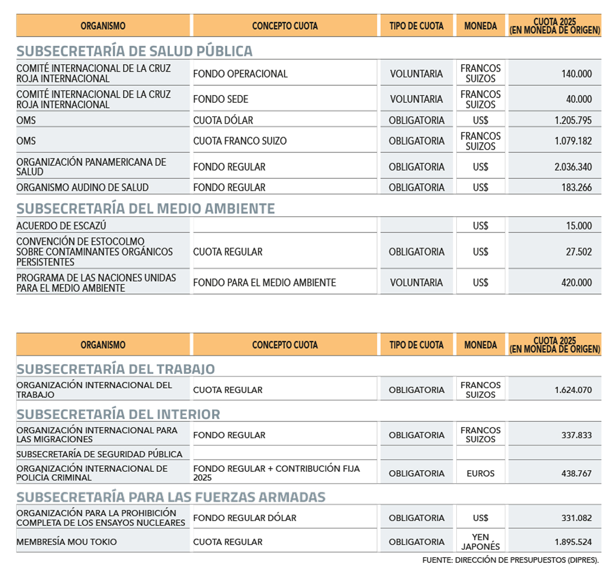 En el texto, por primera vez la Dipres precisa la información sobre los aportes a entidades multilaterales, con datos a 2024, que fue el último año en que los desembolsos fueron de cargo de cada secretaría de Estado.