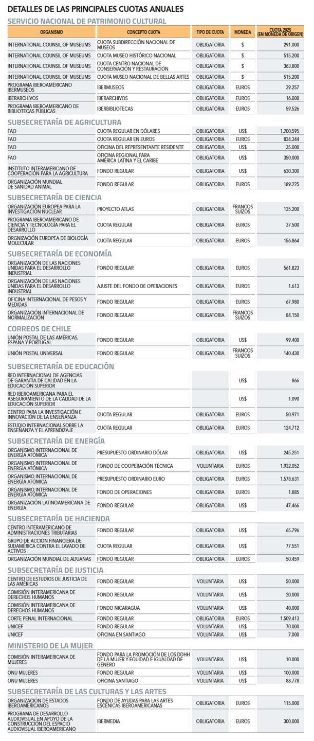 Aprovechando aquello, el pasado 27 de octubre la directora de Presupuestos, Javiera Martínez, remitió un extenso oficio a 31 organizaciones del aparato público estableciendo las nuevas directrices y pidiéndoles información respecto a las cuotas que le corresponden y si el monto es el correcto, para que estas sean asumidas por Relaciones Exteriores.