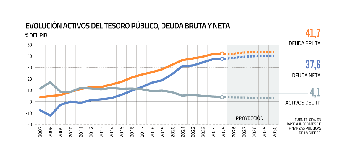 Así, el organismo asegura que las cifras proyectadas para 2026 por el Gobierno que concluyó el 11 de marzo consideran ingresos efectivos equivalentes a un 22% del PIB y estructurales de 21,2% del PIB, ambos inferiores al gasto total de 23,8% del Producto.