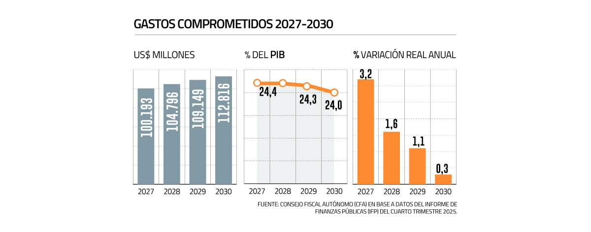 Asimismo, el CFA sostiene que en el mediano plazo persisten presiones relevantes sobre el gasto público. “Cabe destacar que la metodología de proyección financiera de mediano plazo no busca anticipar todos los gastos probables, sino que se construye sobre la base de gastos ya comprometidos, con el objetivo de identificar holguras presupuestarias y necesidades de financiamiento o de ajuste consistentes con las metas fiscales del gobierno”, indica.