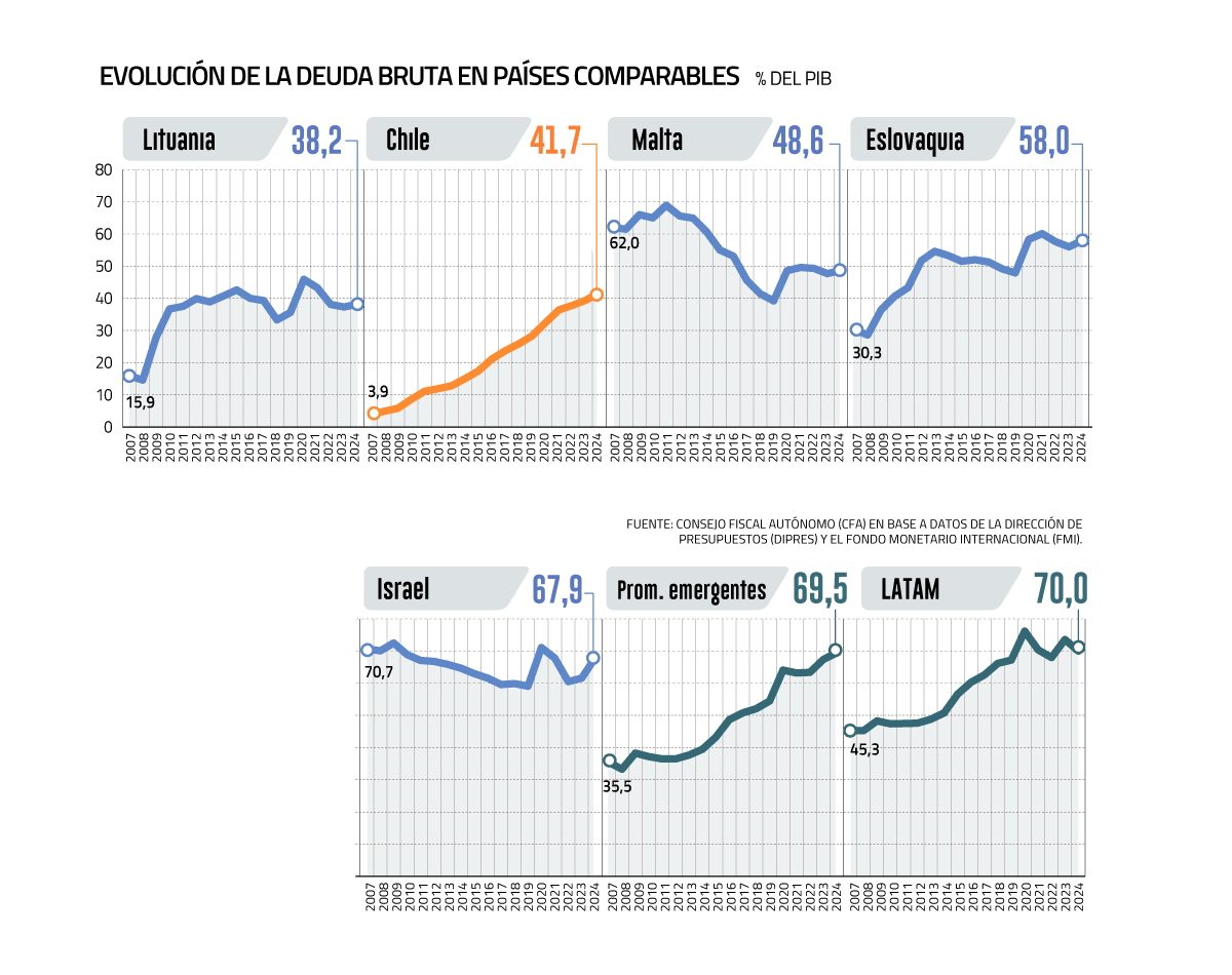 Mantener el actual nivel de deuda prudente en 45% del PIB es la octava idea que expone el CFA, ya que este umbral responde a factores estructurales de la economía chilena. "El Consejo advierte que su modificación, sin cambios previos en esos factores, podría debilitar su rol disciplinario al facilitar la continuidad de déficits estructurales persistentes".