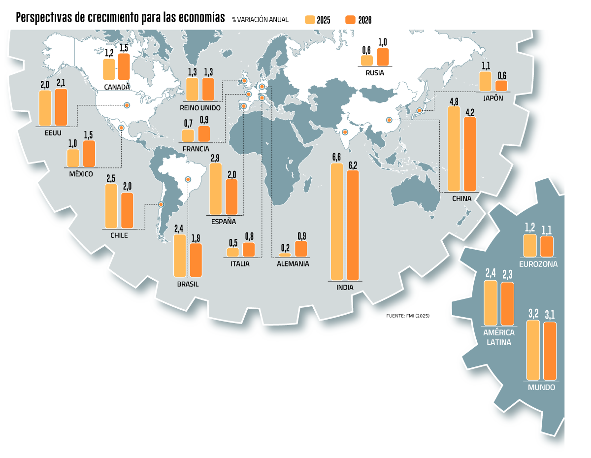 En el caso de las naciones vecinas, Argentina tendrá una expansión de 4,5% y 4% de su Producto para 2025 y 2026, respectivamente. Brasil de 2,4% y 1,9%; Colombia de 2,5% y 2,3%; Perú de 2,9% y 2,7%; Paraguay de 4,4% y 3,7%; y Uruguay de 2,5% y 2,4%.