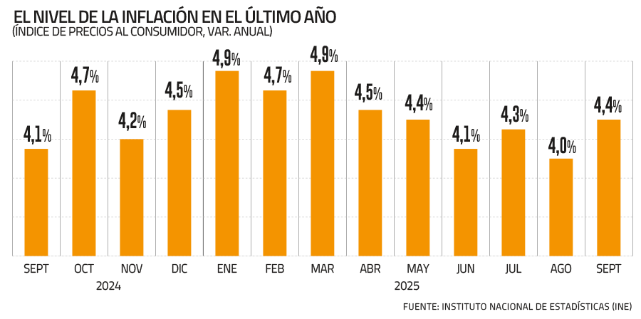 Cabe recordar que los precios internos llevan sobre 4% desde marzo de 2024 si se toman como referencia los datos del INE, mientras que si se mira la serie referencial del Banco Central, la última vez que se ubicó en niveles de 3% fue en junio del año pasado.