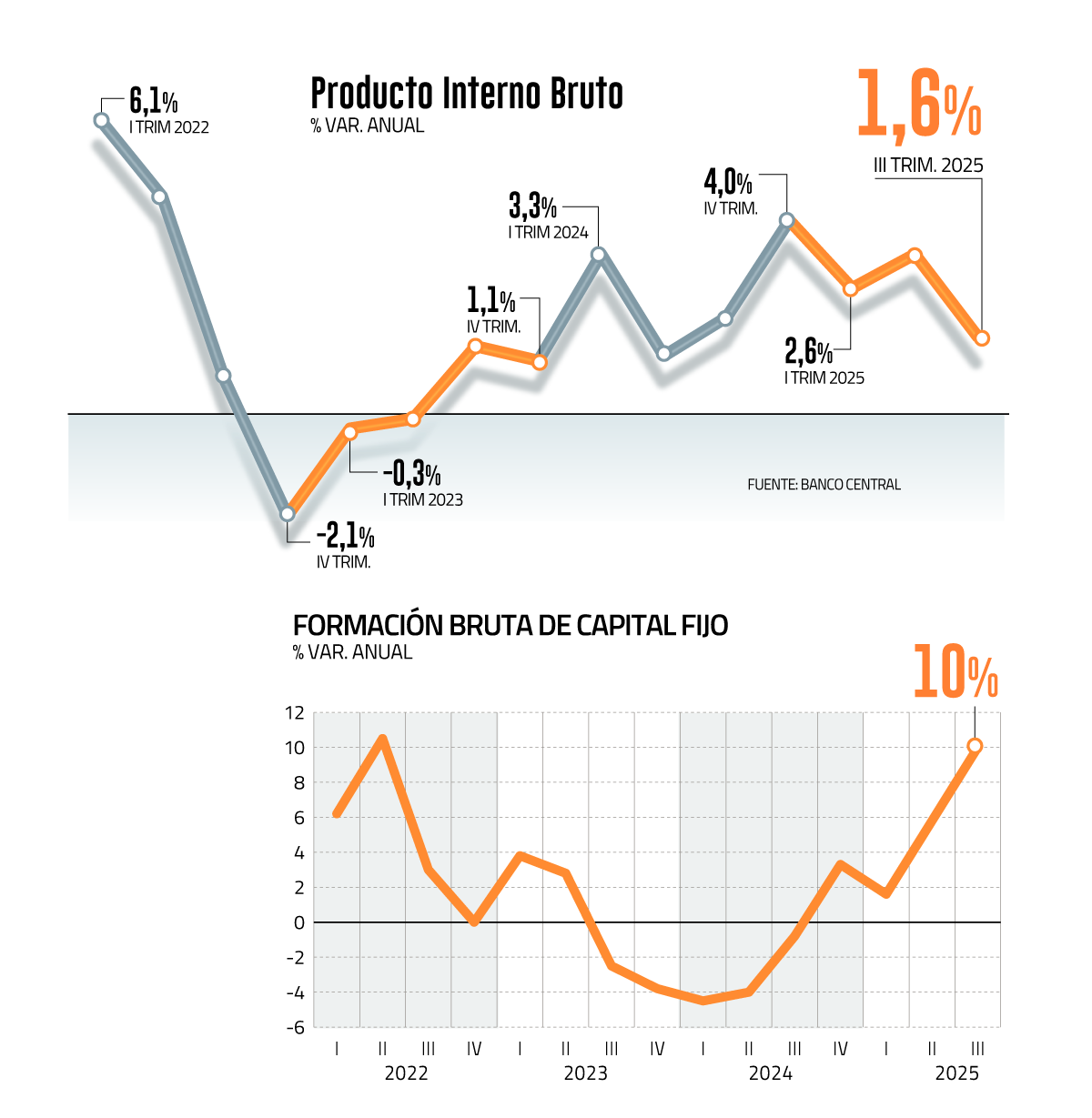 Una expansión de 1,6% registró el Producto Interno Bruto (PIB) del país en el tercer trimestre frente al mismo período de 2024, de acuerdo al informe de Cuentas Nacionales publicado por el Banco Central. Una cifra que se ubicó levemente por debajo de las expectativas del mercado, de 1,8%, según el consenso de Bloomberg, y también inferior al ritmo observado en la primera parte del año.