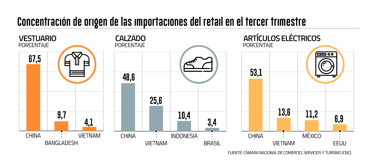 En el lapso julio-septiembre, un 67,5% del vestuario provino de China y un 9,7% de Bangladesh. En calzado, China concentró un 48,6%, seguido por Vietnam con un 25,6%.