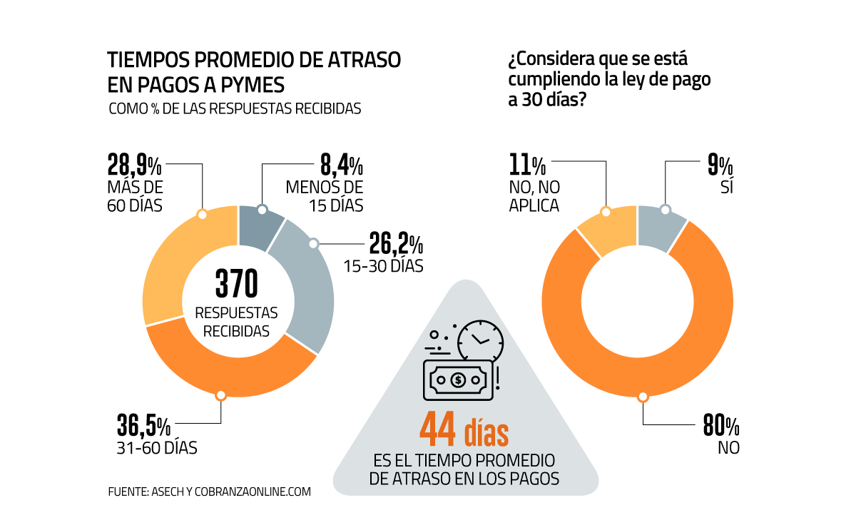 Dato decidor, es que un 80% de las pequeñas y medianas empresas -sondeadas en una encuesta de la Asociación de Emprendedores de Chile (Asech) y CobranzaOnline.com- admitieron enfrentar retrasos en la respuesta por venta de productos o la prestación de sus servicios a distintas contrapartes.
