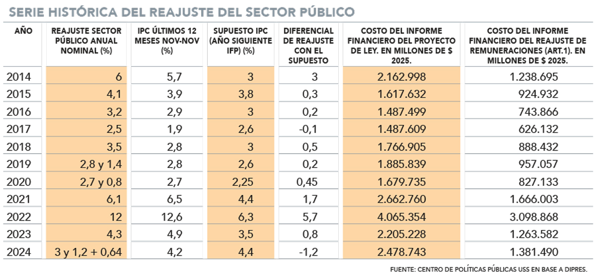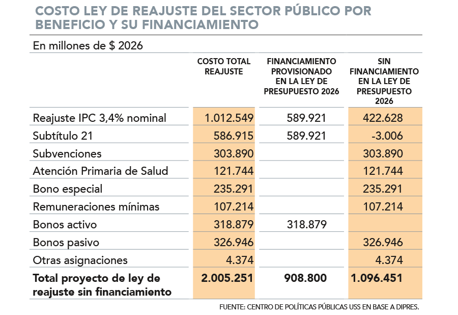 Las especialistas recuerdan que, a diferencia de años anteriores, la Ley de Presupuestos 2026 no consideró la variación por el Índice de Precios al Consumidor (IPC) de los salarios en el subtítulo de gasto en personal, y sólo incluyó financiamiento por cerca de US$ 950 millones en el Tesoro Público para solventar el mayor gasto que signifique el acuerdo con la Mesa del Sector Público.