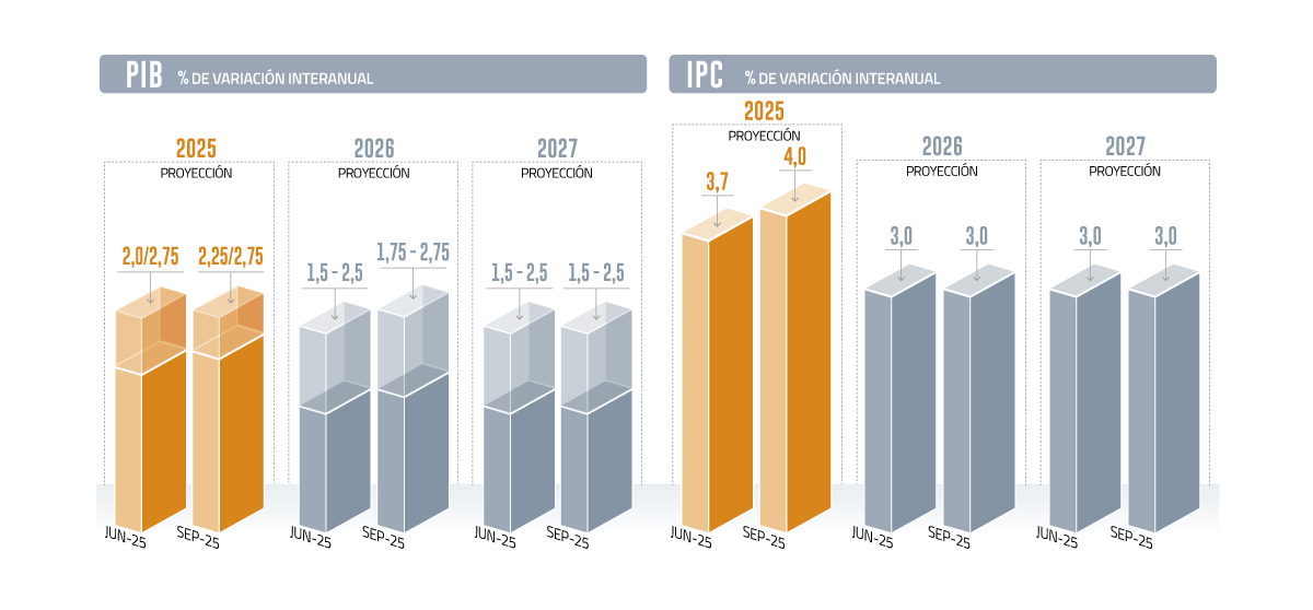 Para 2026 el alza fue de 1,5%-2,5% a 1,75-2,75%, mientras que para 2027 se mantuvo en 1,5-2,5%.