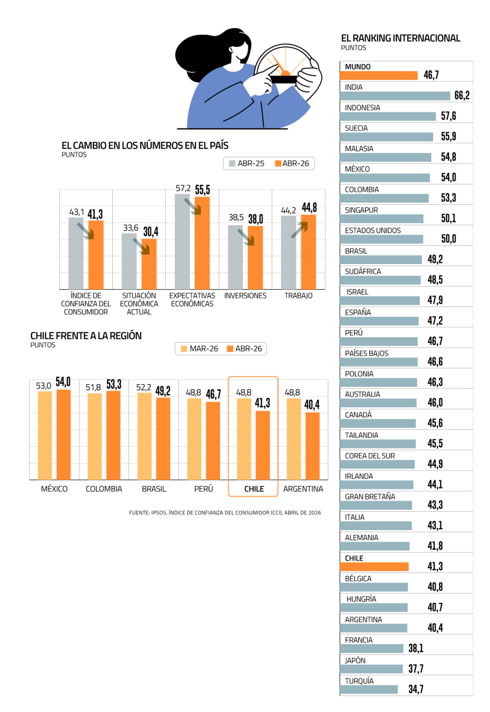 El Índice Global de Confianza del Consumidor de Ipsos bajó 2,7 puntos este mes y se situó en 46,7. Esta es su segunda mayor caída hasta la fecha, solo por detrás de abril de 2020, la primera lectura tras el inicio de la pandemia. Ahora está un punto por debajo del nivel de la misma época de 2025.