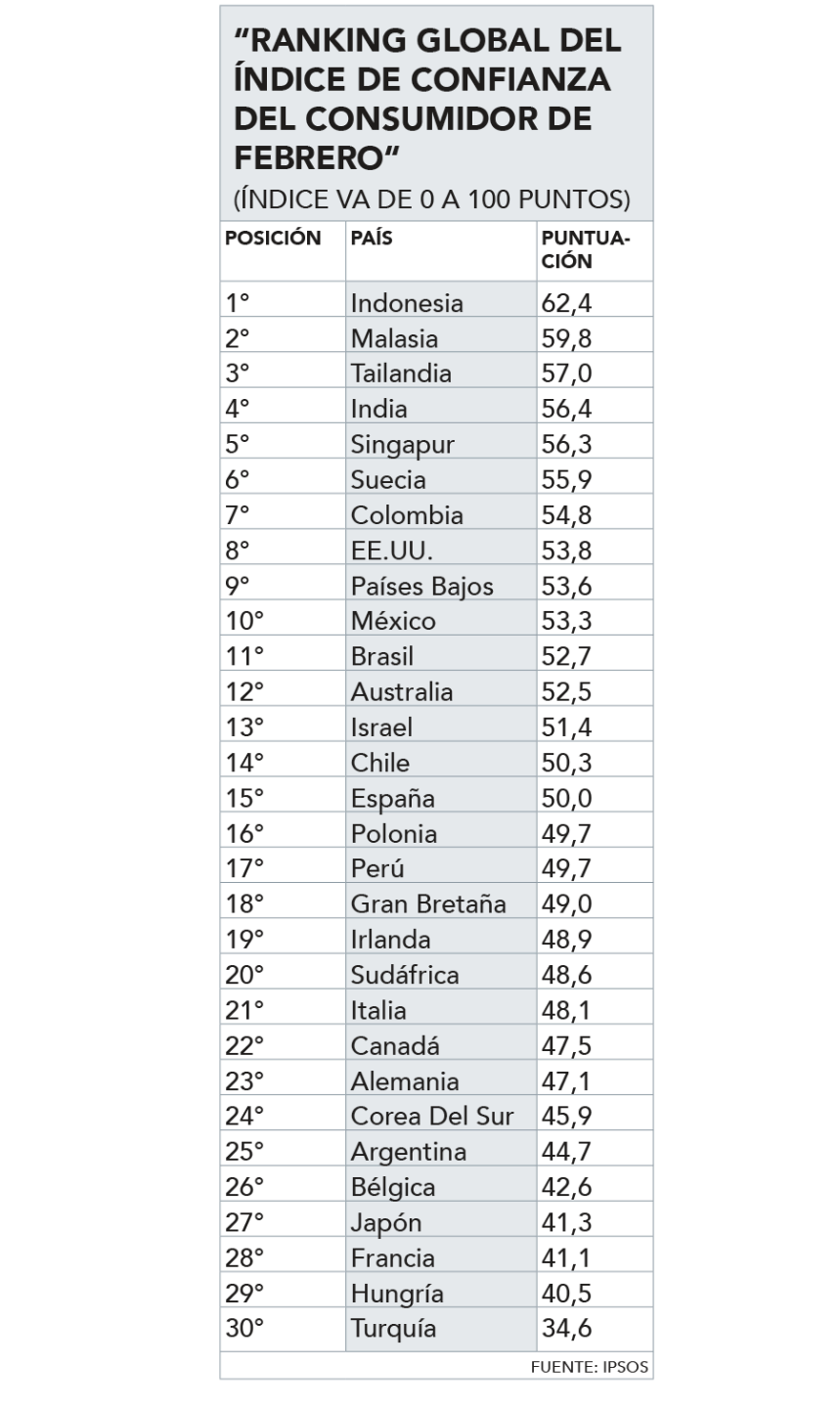 En cuanto al panorama mundial en general, también se percibe un “incipiente mejor ánimo”, aseguró el reporte. El Índice Global de Confianza del Consumidor se mantiene estable este mes (+0,1 punto) y se sitúa en 50. Actualmente, se sitúa 1,2 puntos por encima de su lectura de la misma época del año pasado.