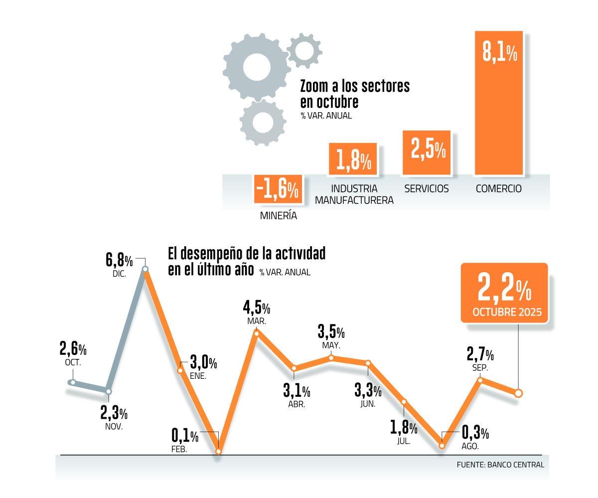 El economista y estratega de inversiones para Latam de Zurich AGF, Gustavo Yana, subrayó que desde una perspectiva sectorial, el comercio volvió a liderar el crecimiento anual con un sólido 8,1%, destacando que octubre tuvo la misma cantidad de días hábiles que el año anterior, lo que confirma la resiliencia del consumo privado como uno de los pilares del crecimiento en 2025.