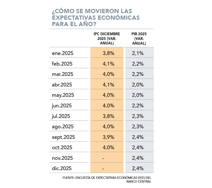 El Banco Central publicó este miércoles la Encuesta de Expectativas Económicas (EEE). No fue cualquiera, sino que la última del año y, por lo mismo, el escenario final que ven los académicos, consultores y ejecutivos de instituciones financieras consultados por el ente autónomo para lo que será el cierre de 2025 en materia del Producto Interno Bruto (PIB) y la inflación, entre las principales variables.