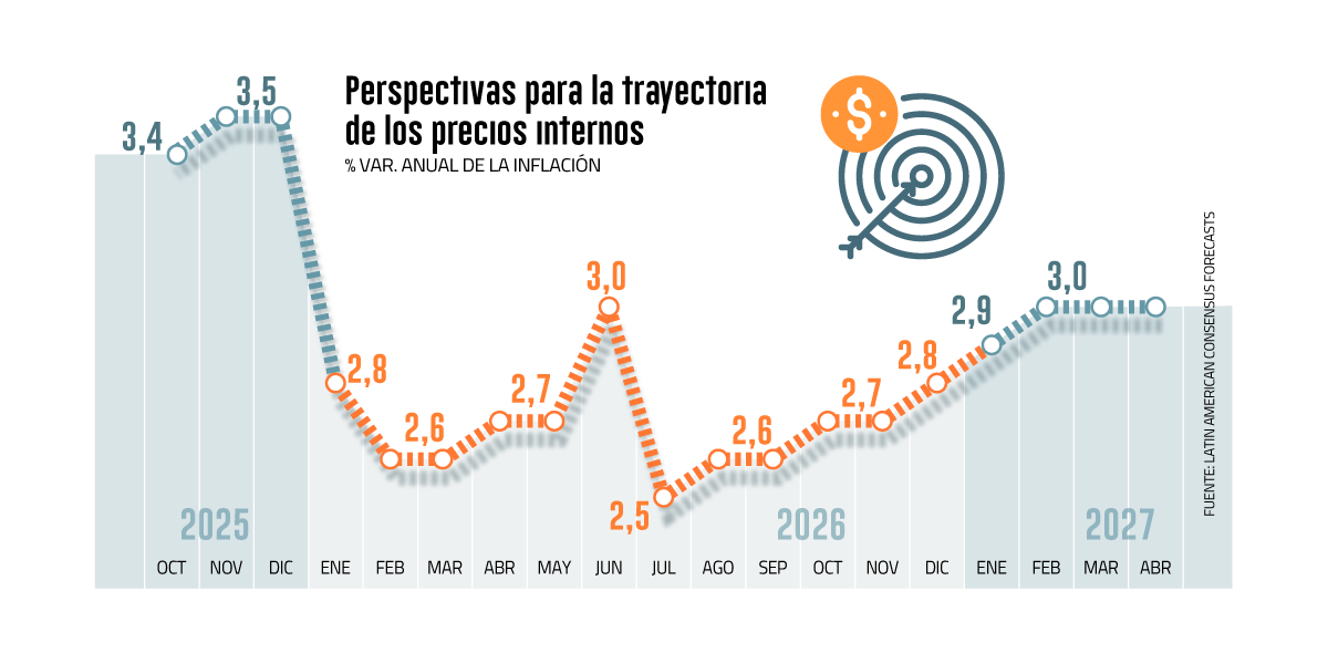 Tras moderar el ritmo desde 3,5% a 2,8% en enero último, frente al mismo período de 2025, el Índice de Precios al Consumidor (IPC) recién podría volver a pasar por el número objetivo en junio, según las proyecciones que reportó el último informe del Latin American Consensus Forecast, que reúne la visión de cerca de una treintena de entidades.