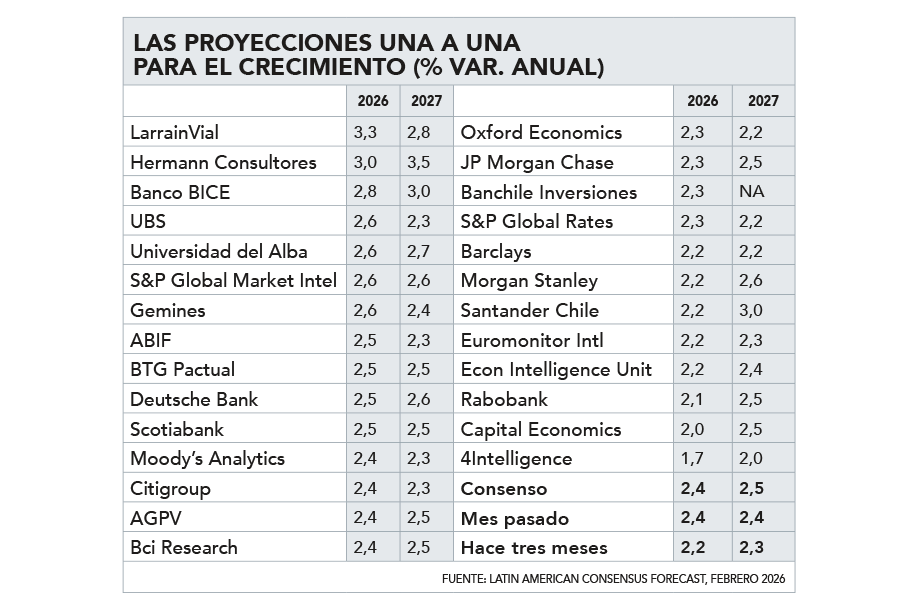 Este escenario de menor inflación iría acompañado de un crecimiento muy similar al observado en 2025 del orden de 2,4%, según el consenso que arrojó el informe del Latin American, cifra cercana al centro de lo visualizado en el último IPoM (2% a 3%).