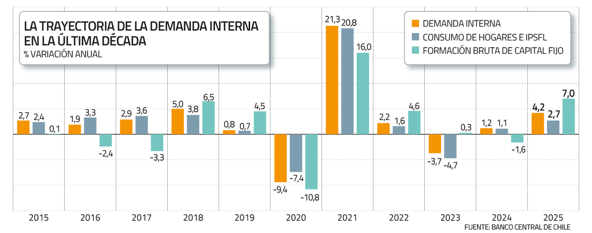 Respecto a la actividad de 2025, el ente emisor explicó que reflejó el desempeño de la demanda interna, la que fue impulsada tanto por la inversión como por el consumo.