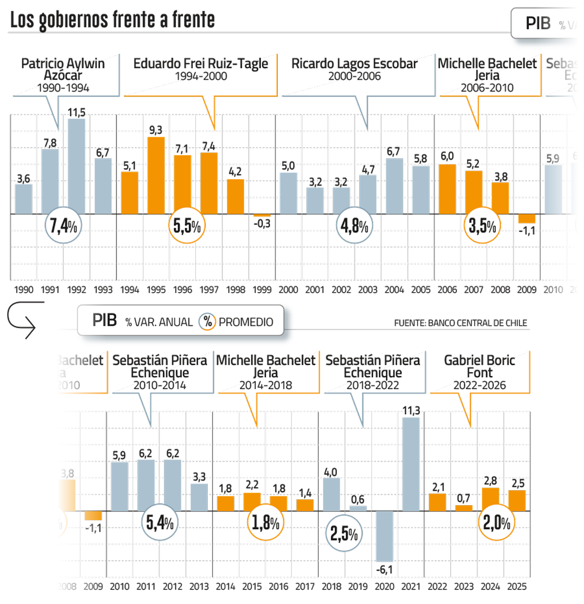 Así, el promedio del PIB de los últimos cuatro años, correspondientes a la administración del exPresidente Gabriel Boric, fue de 2%, el segundo menor resultado desde la vuelta a la democracia y sólo ubicado por encima del 1,8% con que terminó Michelle Bachelet en su retorno a la Presidencia entre 2014 y 2017.