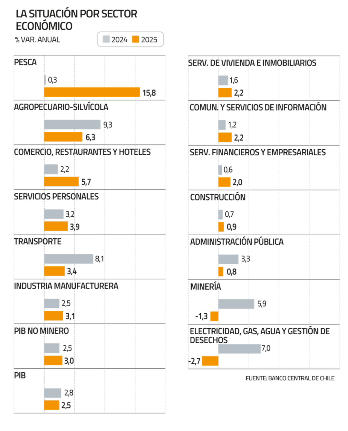 En tanto, el sector agropecuario-silvícola tuvo un aumentó de 6,3% en su actividad el 2025, debido a mayor producción en todas sus áreas a excepción de la silvicultura. Por su parte, la pesca creció 15,8%.