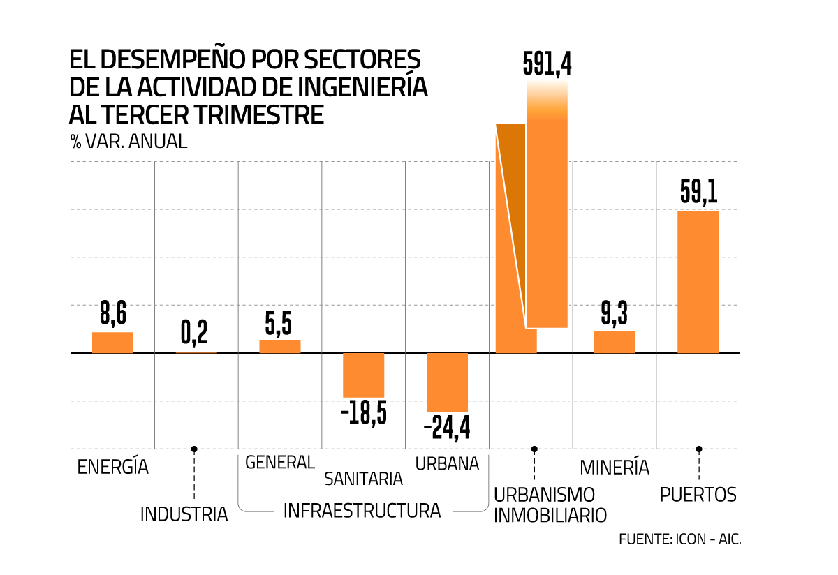 Pero en la comparación anual, los rubros de urbanismo inmobiliario, puertos y energía exhibieron el mayor dinamismo, posicionándose como los principales motores de la actividad de ingeniería durante el período.